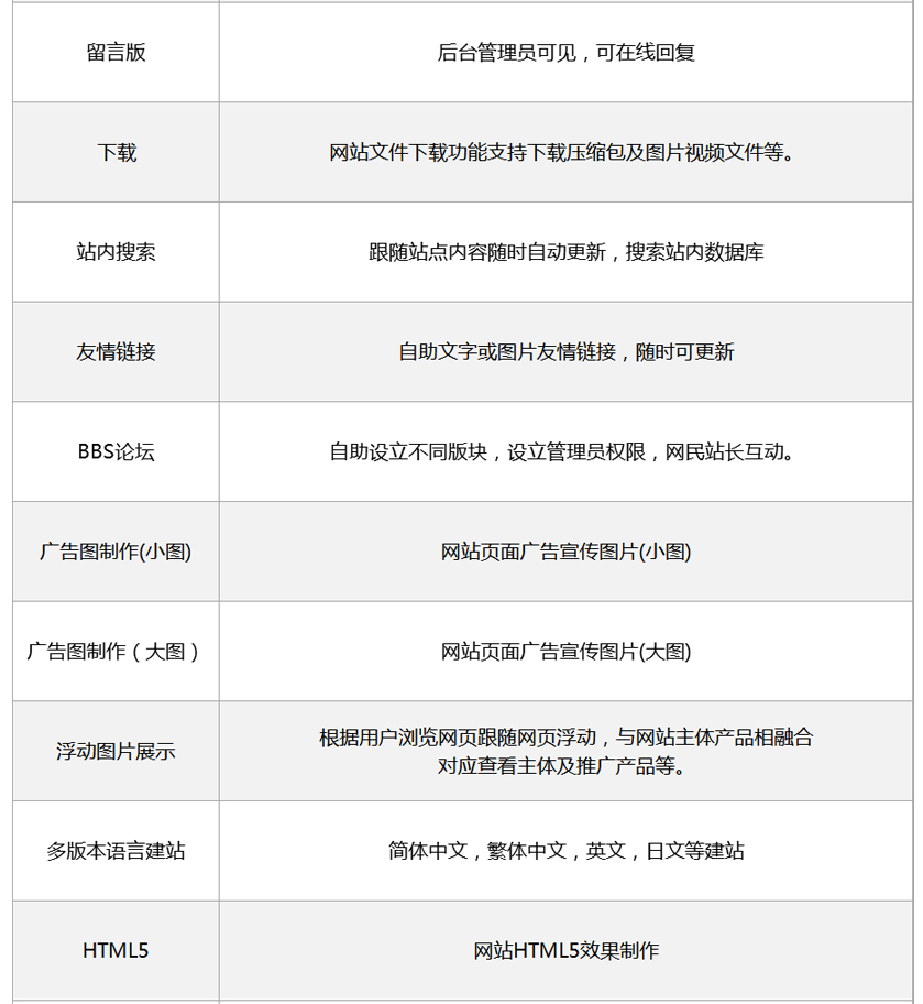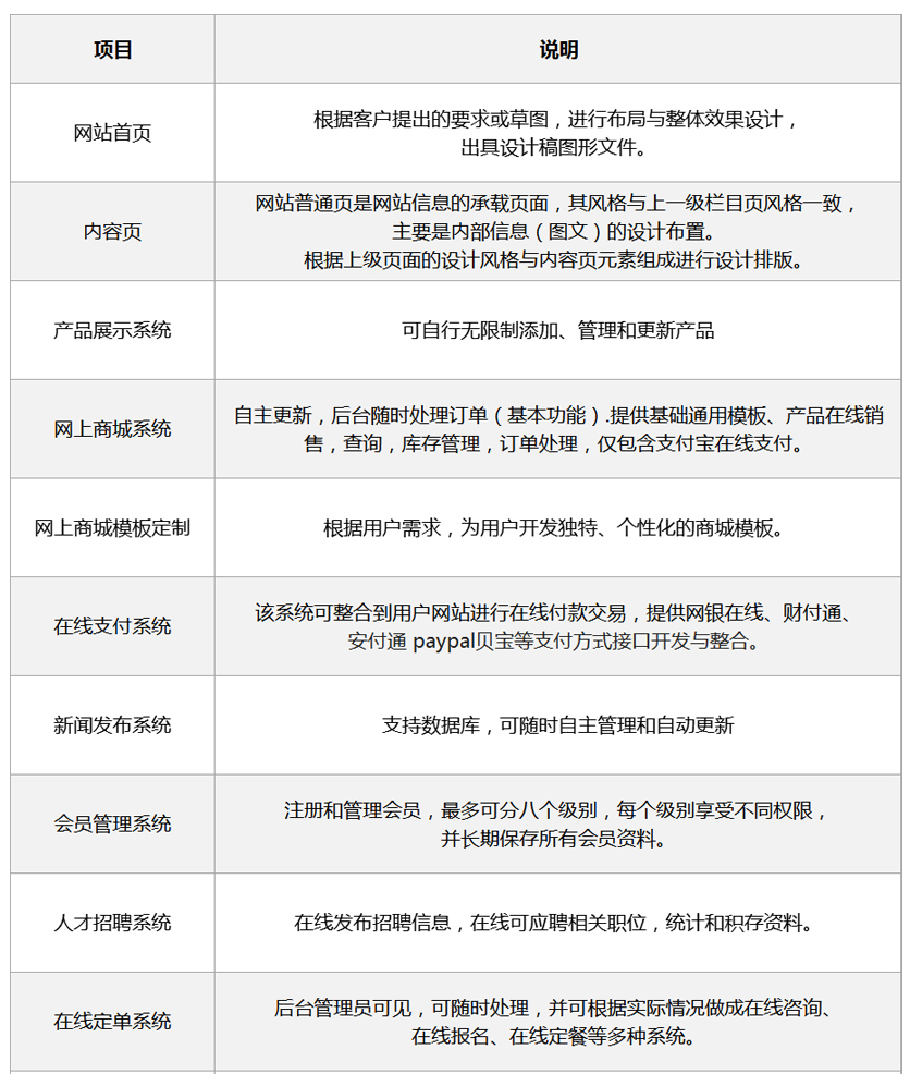 定制(zhì)網站功能(néng)系統一(yī)覽表